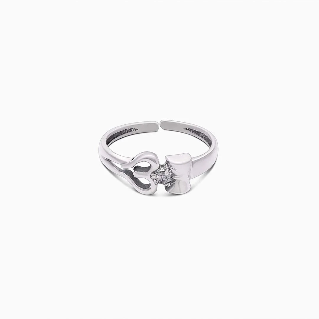 The ring features the iconic Trishul (Trident), representing the unity of creation, preservation, and destruction, along with the Damru, symbolizing the cosmic sound of creation. Plated with sterling 925 silver, this piece blends elegance and durability, and its adjustable design ensures a comfortable fit for any finger size.