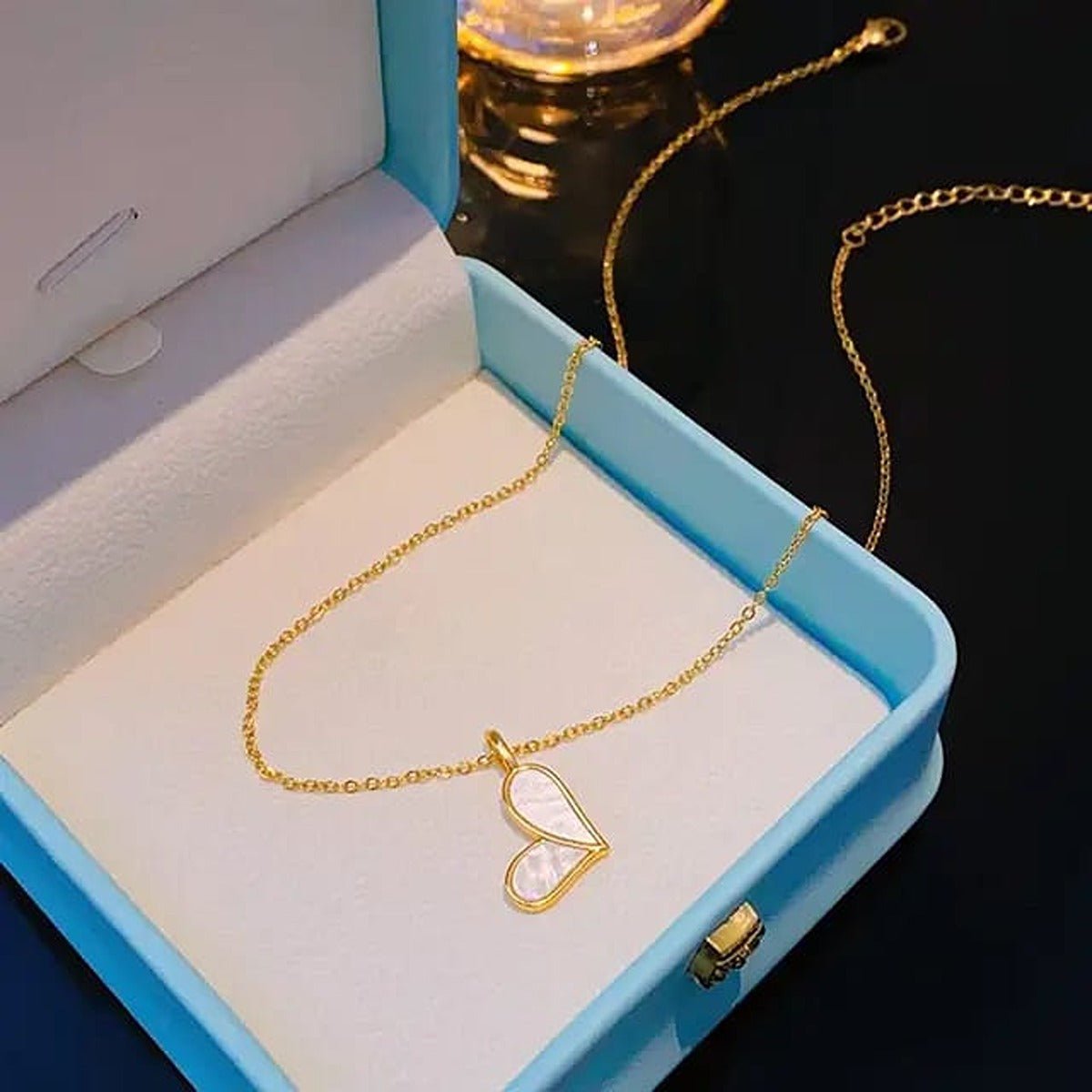 This exquisite gold heart necklace, elegantly presented in a luxurious box, features a beautifully crafted Korean gold pendant complemented by a delicate chain. Its timeless design makes it a perfect gift for any occasion, symbolizing love and affection. The high-quality materials ensure durability and a radiant shine, making it a cherished addition to any jewelry collection.