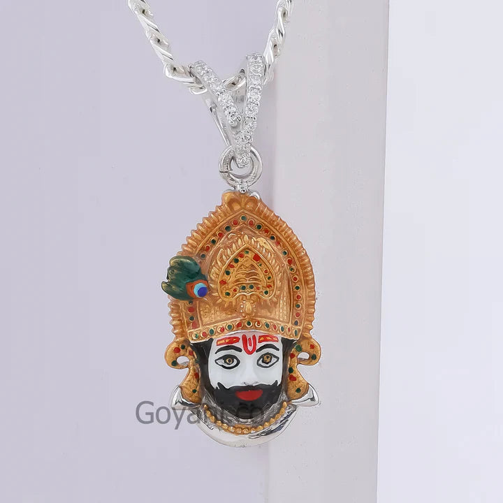 Crafted with high-quality silver plating, this pendant features intricate enamel detailing, capturing the essence of Lord Khatu Shyam's iconic imagery. The vibrant colors of the enamel work add a touch of elegance and spirituality to your look, making it a perfect accessory for daily wear or special occasions.