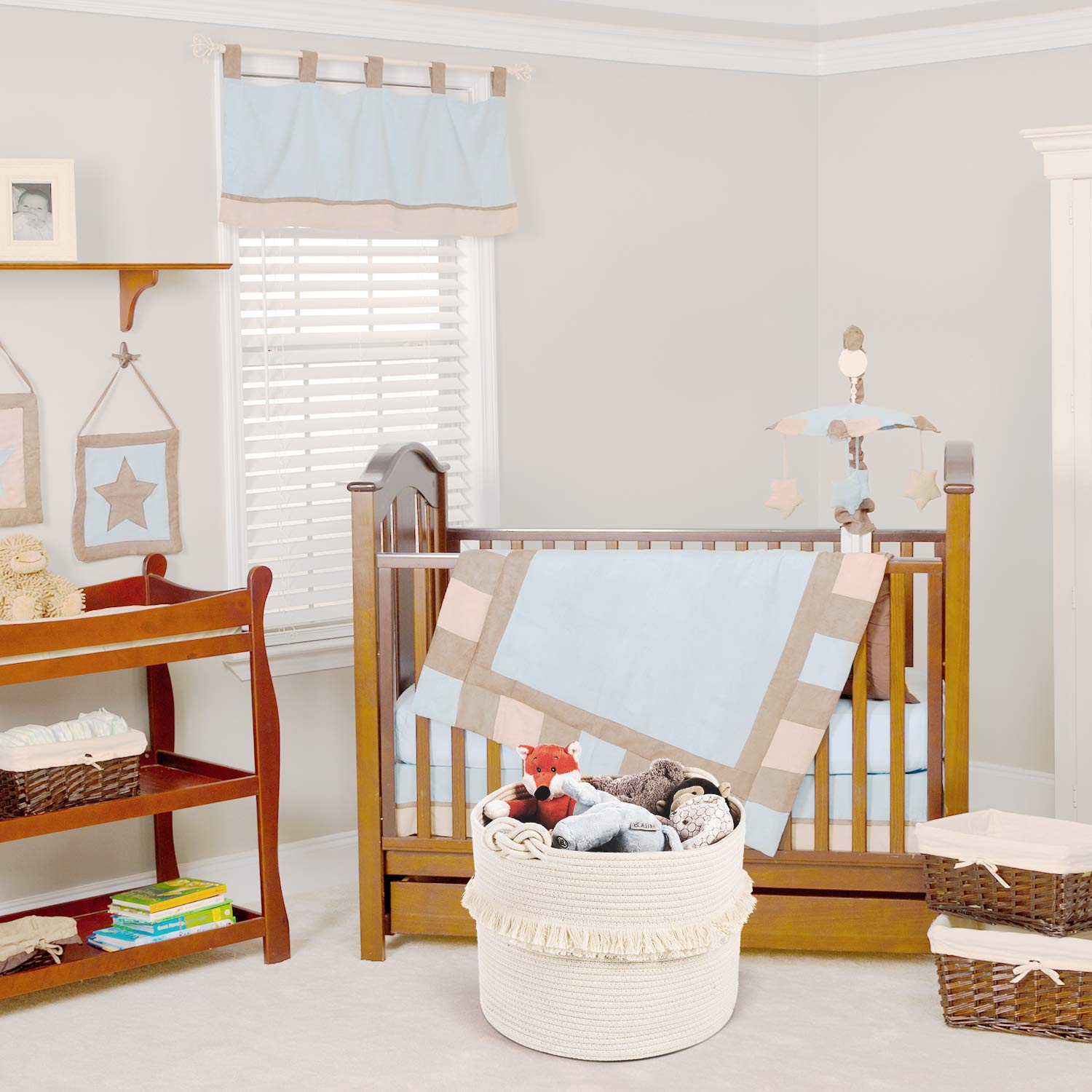 - KNOT TIE HANDLES: This storage bin has the most popular match nowadays with pretty knot accents as the handles; our baby laundry basket can easily be moved from room to room to store diapers, blankets, towels, toys, bibs, books, and so on