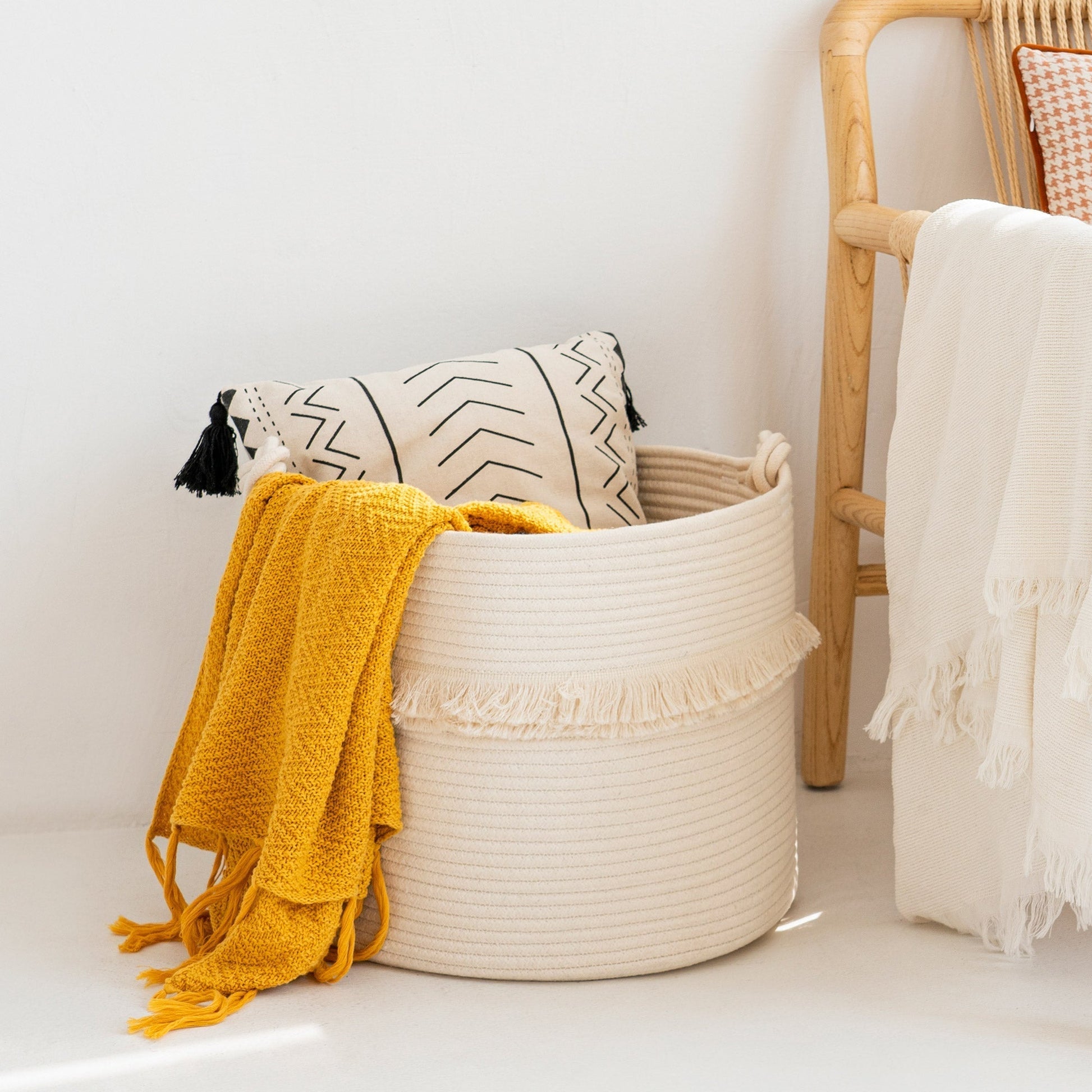 - GREAT QUALITY: Our storage basket is made from strong cotton woven rope; organic cotton rope, no chemicals, has good resilience, safe and healthy; this elegant, stylish white material is attractive and durable