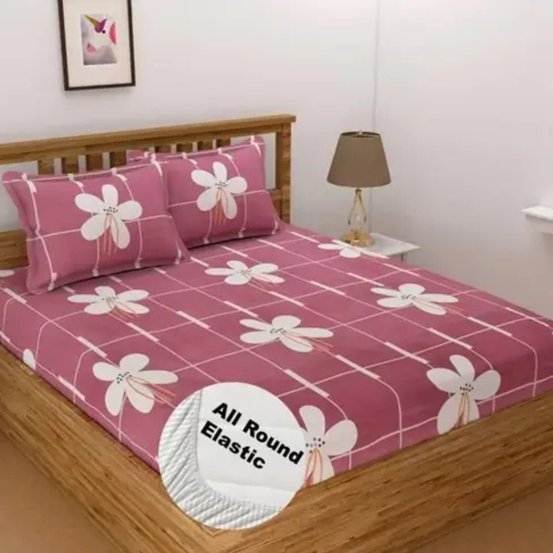 Premium Cotton Elastic Fitted Bedsheets with 2 Pillow Covers | Double Bed with All Around Elastic