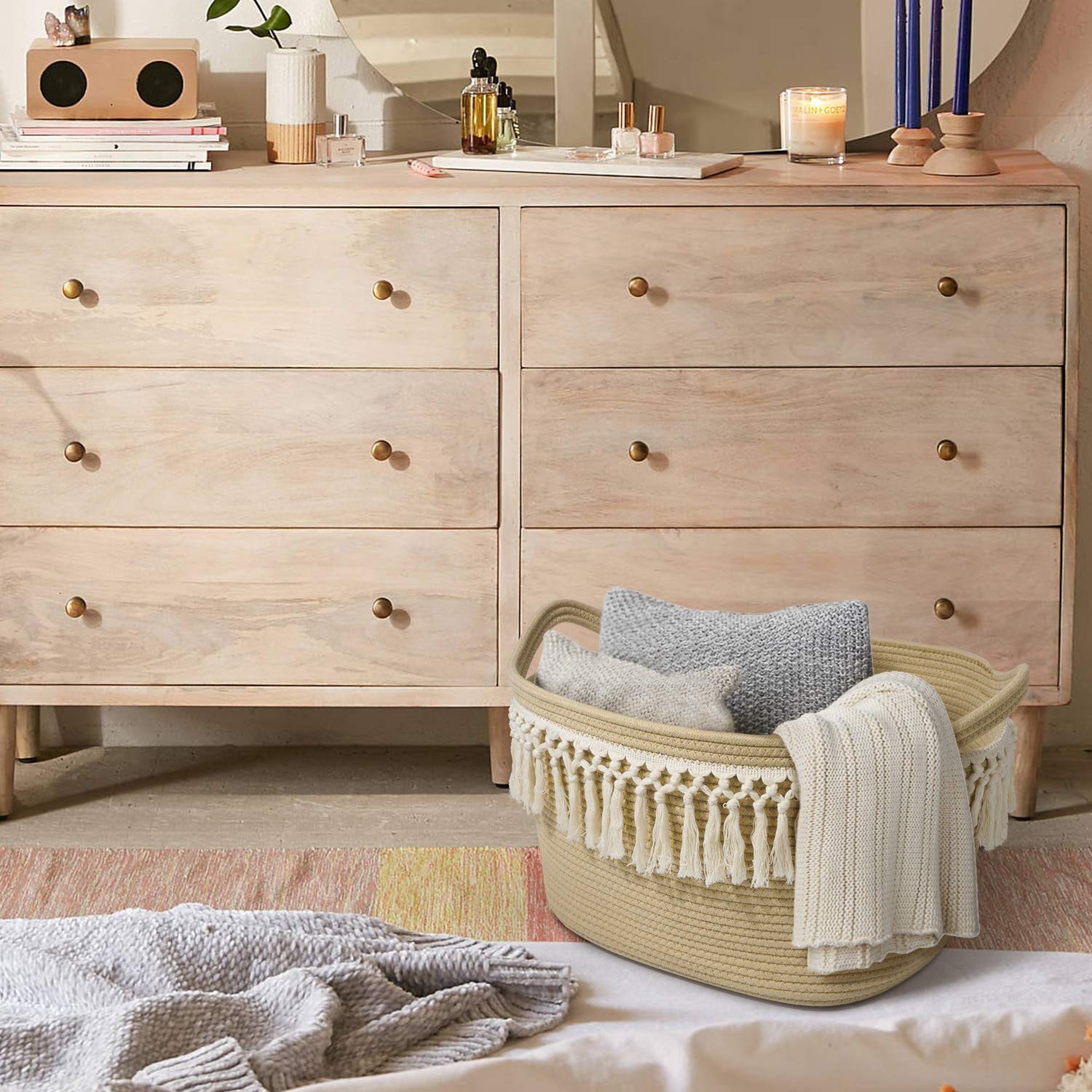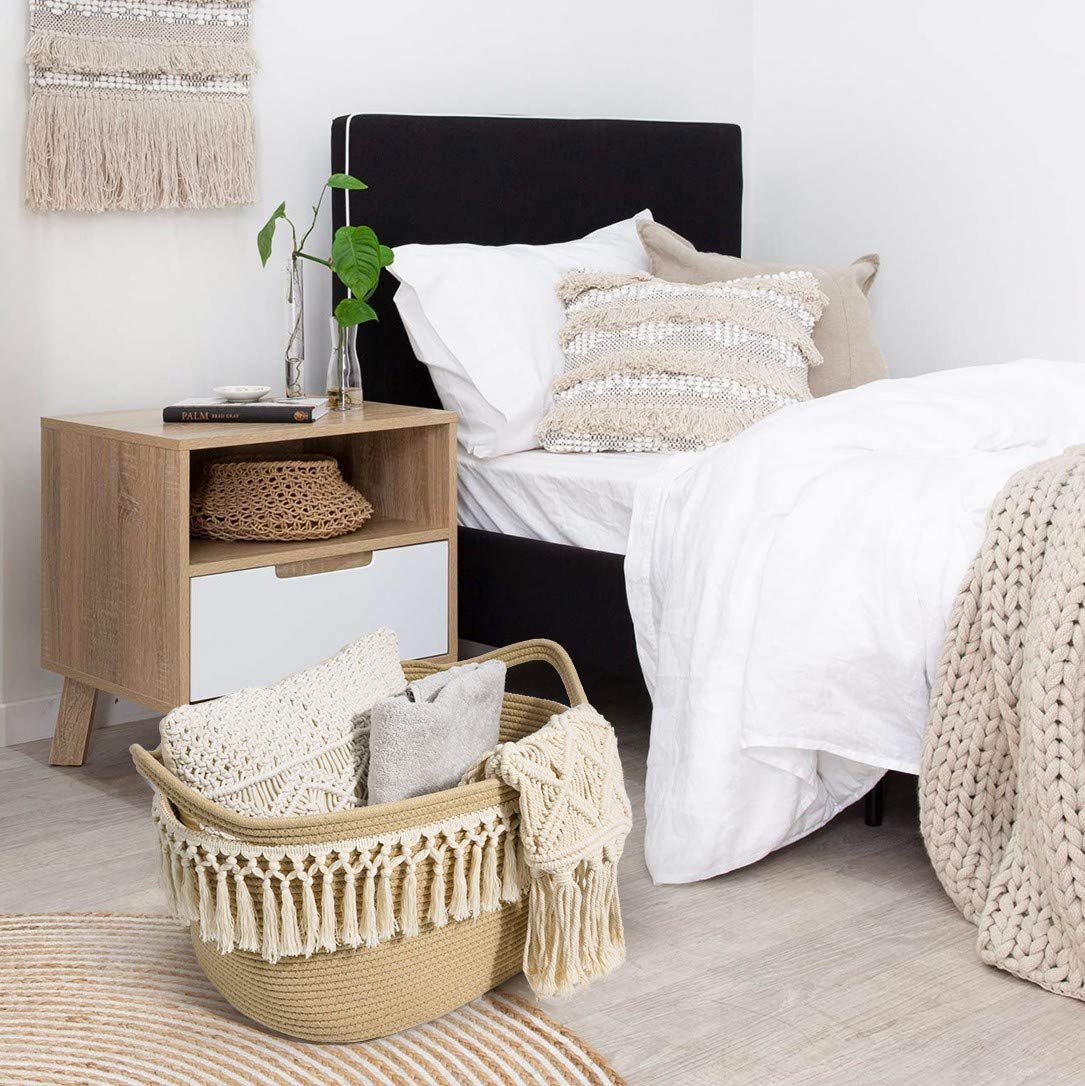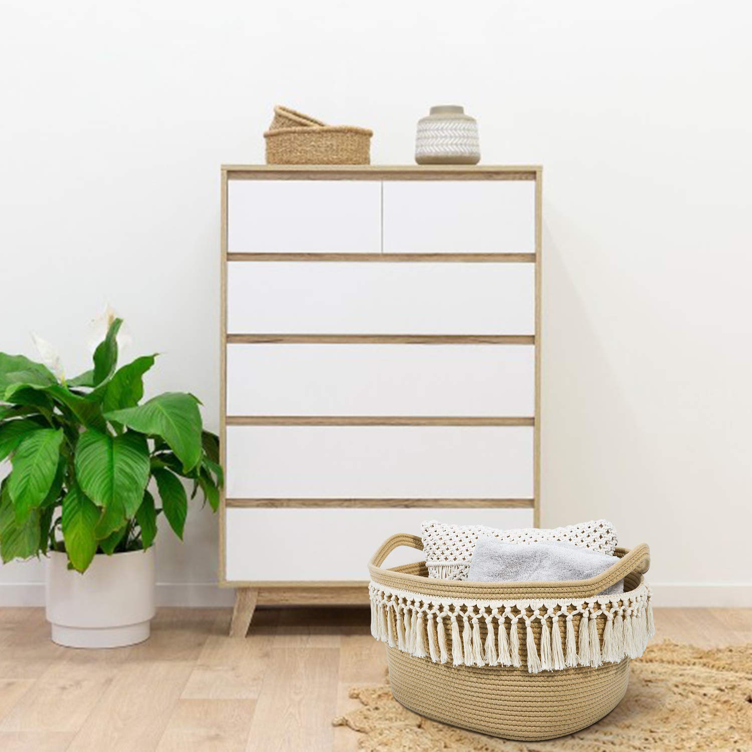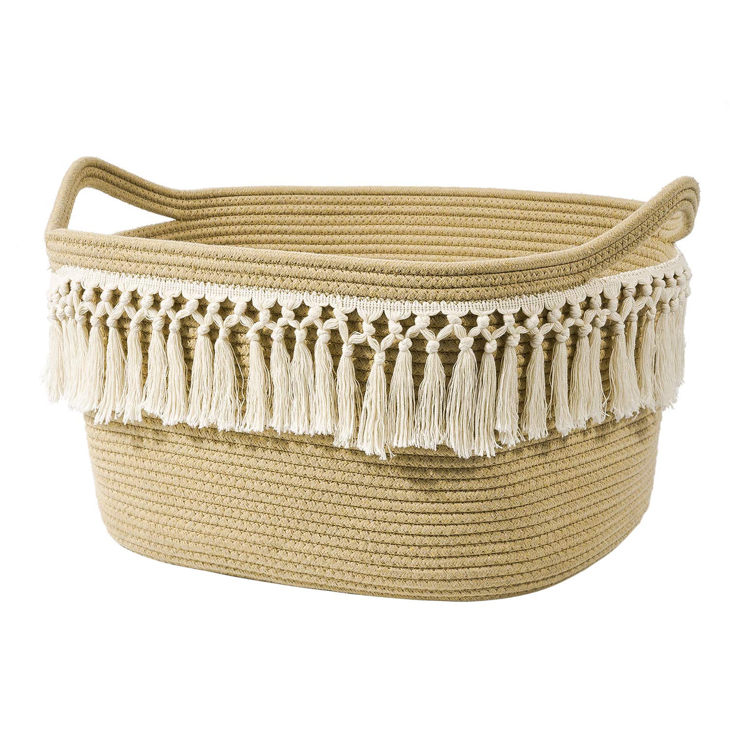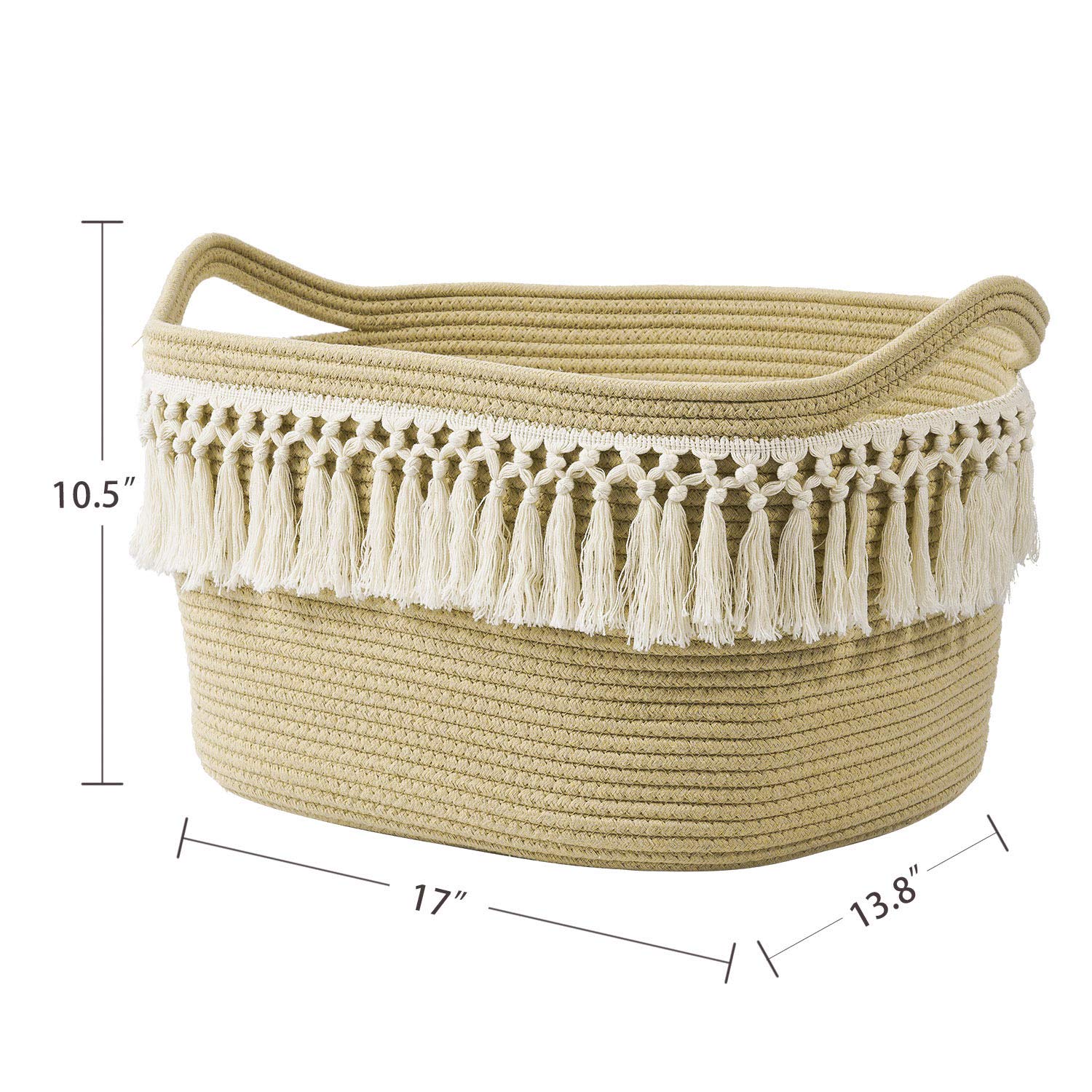 Rectangle Woven Basket Tassel Cotton Rope Storage Basket with Handles,17'' x13.8'' x10.5''