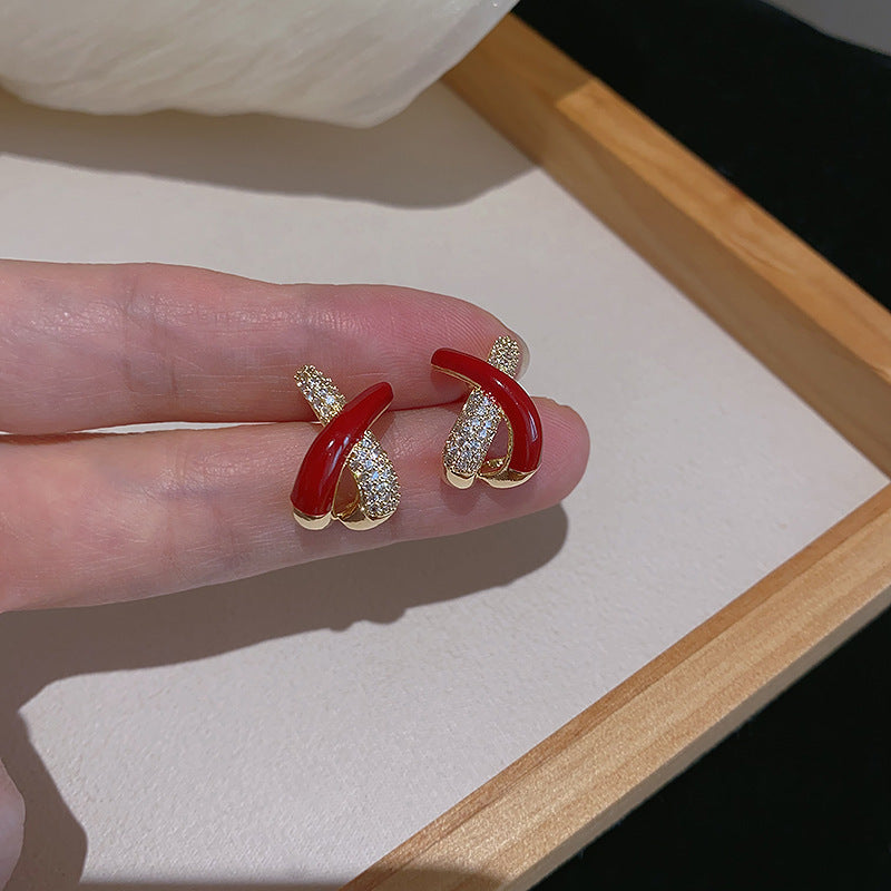 Red Cross Shaped Diamond Inlaid Silver Needle Stud Earrings